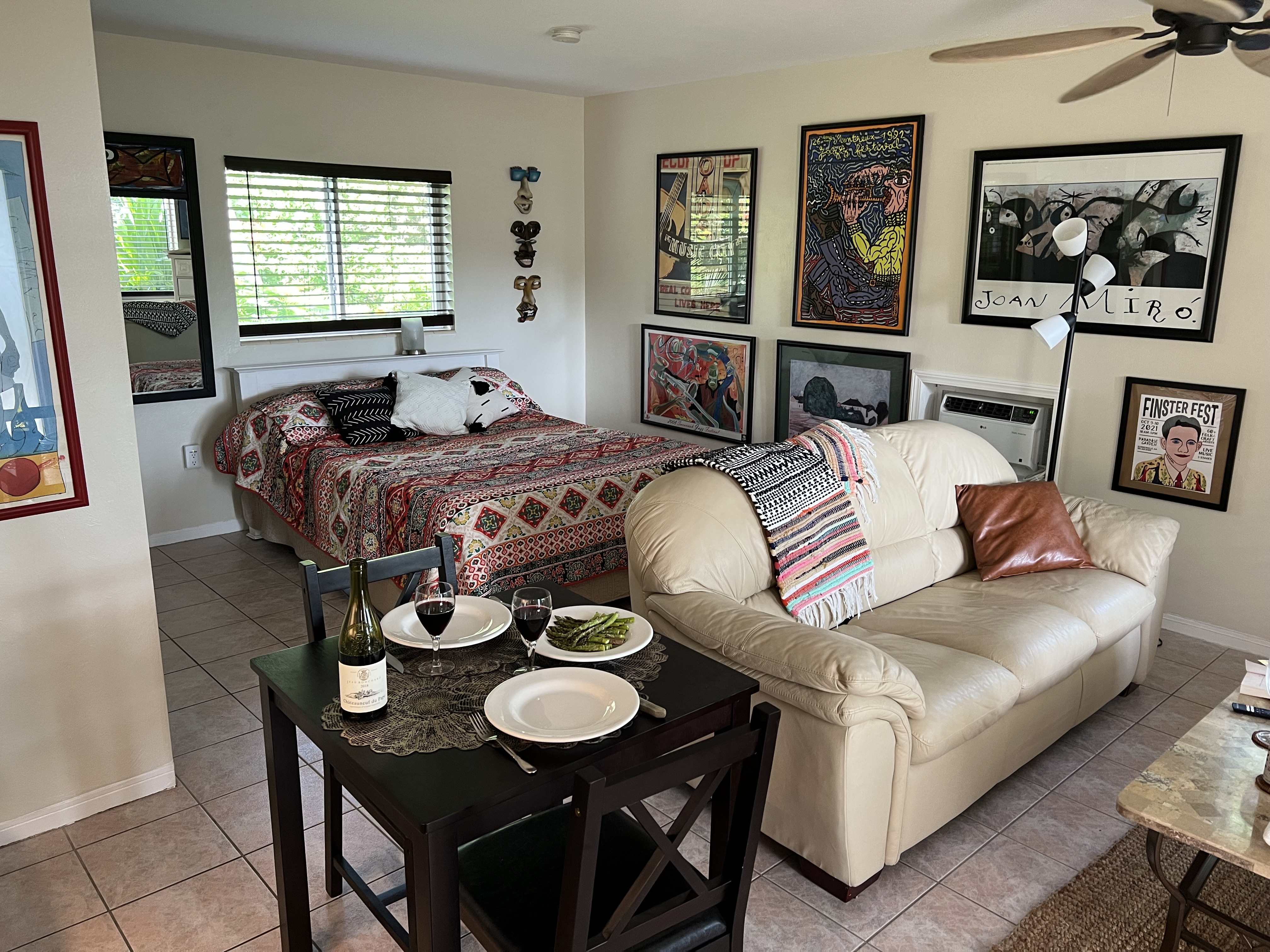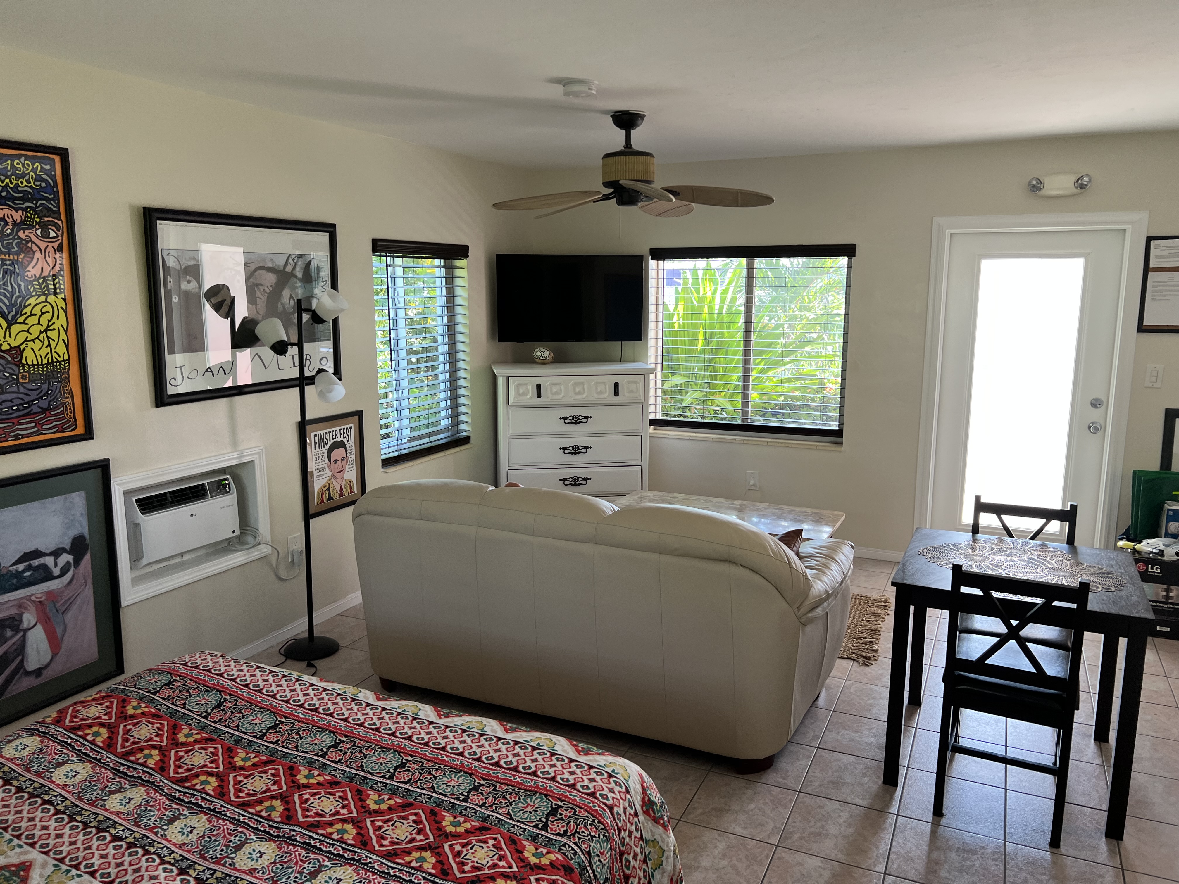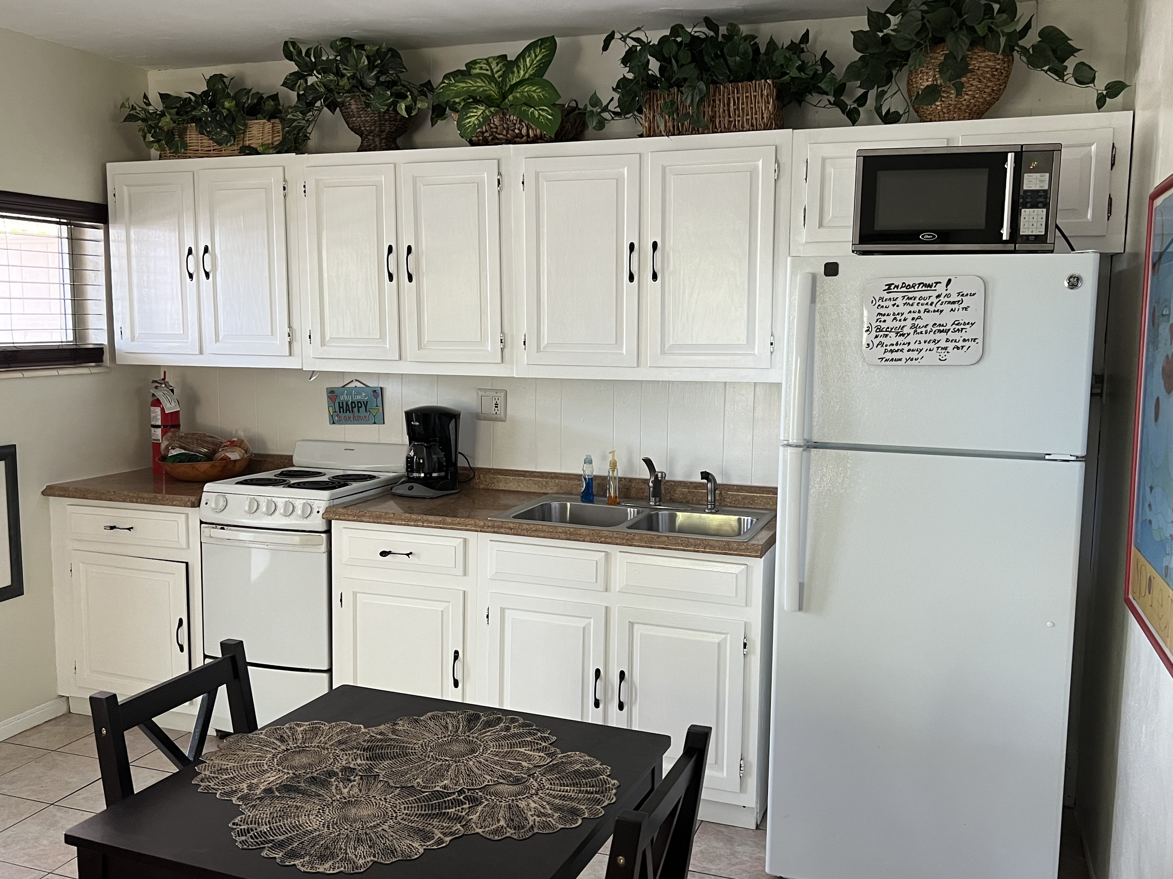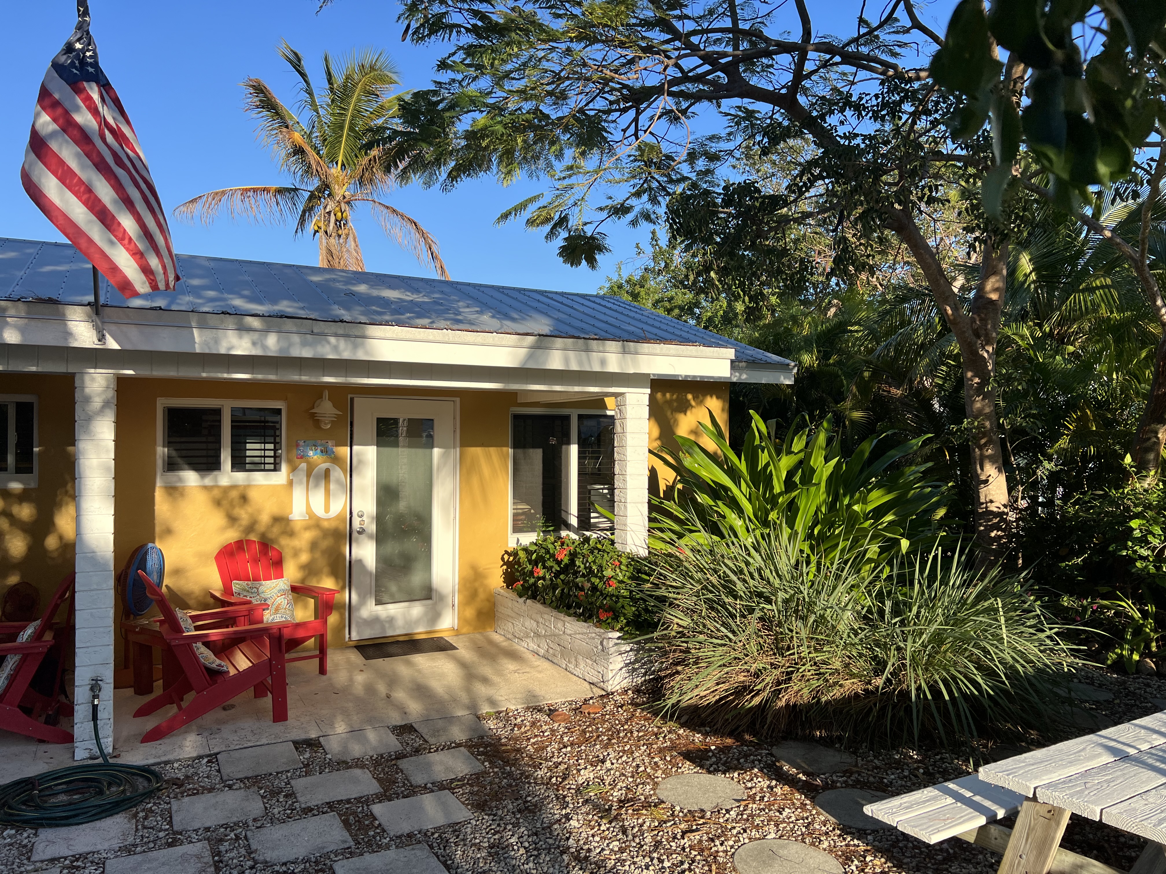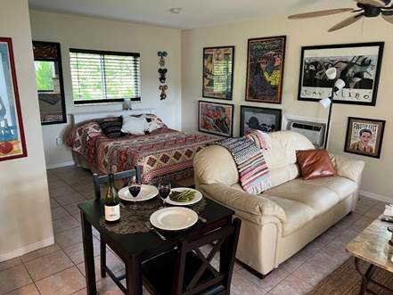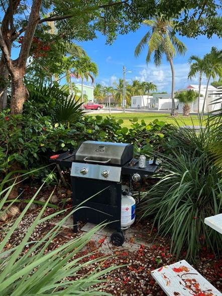 Unit 10 This Unit is a fully furnished studio/efficiency. The unit has a queen size bed, small dining table with two chairs and a comfy leather sofa. It has a fully equipped kitchen, and a private bathroom (toilet, sink and shower). All dishes, pots and pans, towels and linens are provided (not Beach/Pool towels). The AC will keep you cool at all times. Smart TV and access to high speed WiFi. The studio has a front porch with two chairs and a small table. It has a small front yard with tropical plants and has its own gas-BBQ grill and picnic table with a large umbrella for shade. |