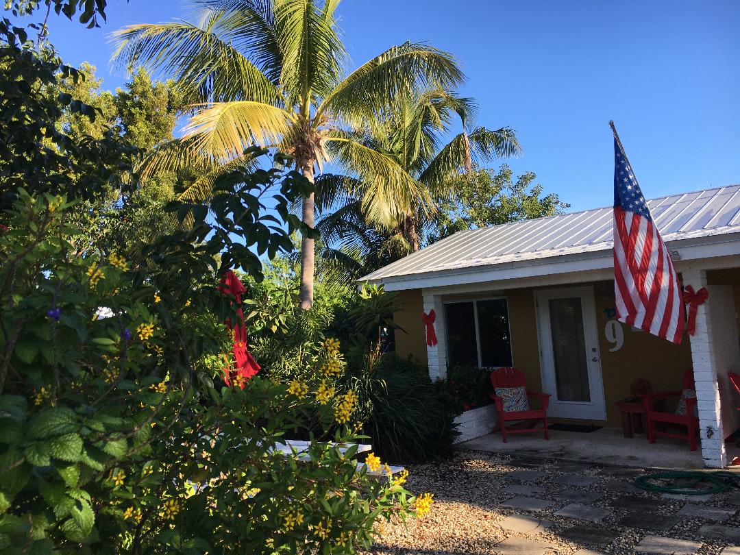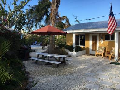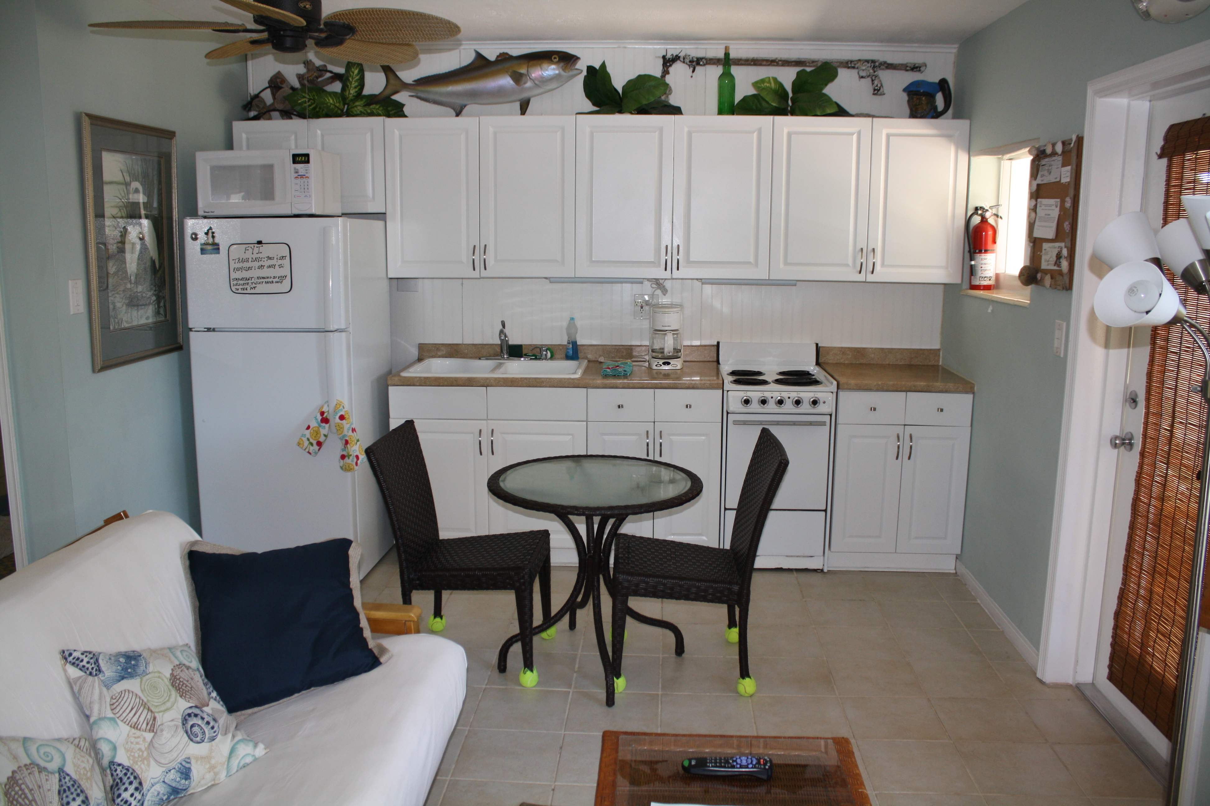 Unit 9 This unit is a fully furnished studio/efficiency. It has two single beds, a futon sofa with a small coffee table, and a small dining table with two chairs and a private bathroom (toilet, sink and shower). It has a fully equipped kitchen with full size refrigerator with freezer, 4 burner stove, microwave and coffee maker. All dishes, pots and pans, towels and linens are provided (not Beach/Pool towels). A quiet mini-split AC will keep you cool at all times.� Smart TV and 100 MB WiFi. The studio has a front porch with two chairs and a small table. It has a small front yard with tropical plants and has its own gas-BBQ grill and picnic table with a large umbrella for shade. |