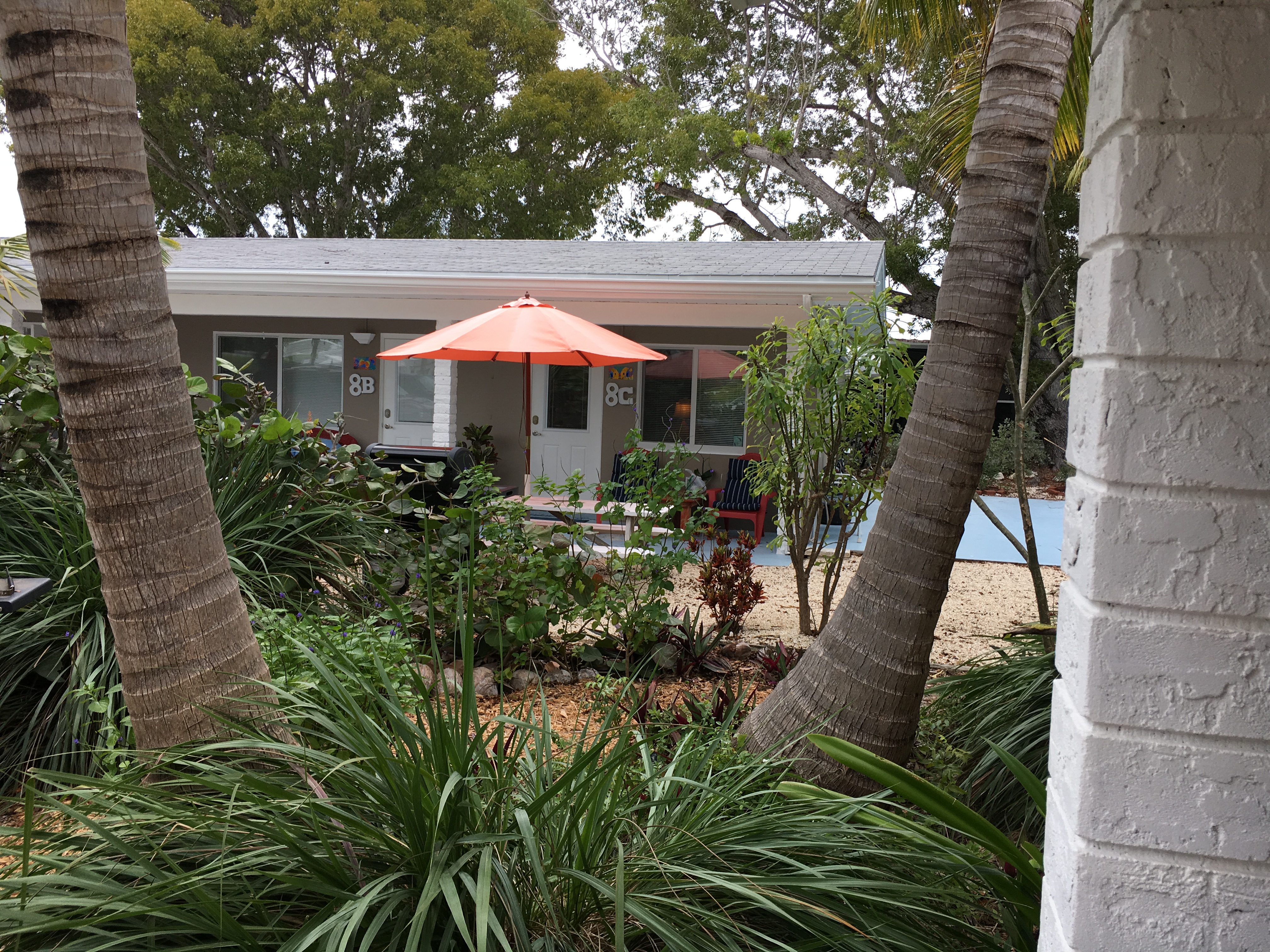 small table. It has a small front yard with tropical plants and has its own gas-BBQ