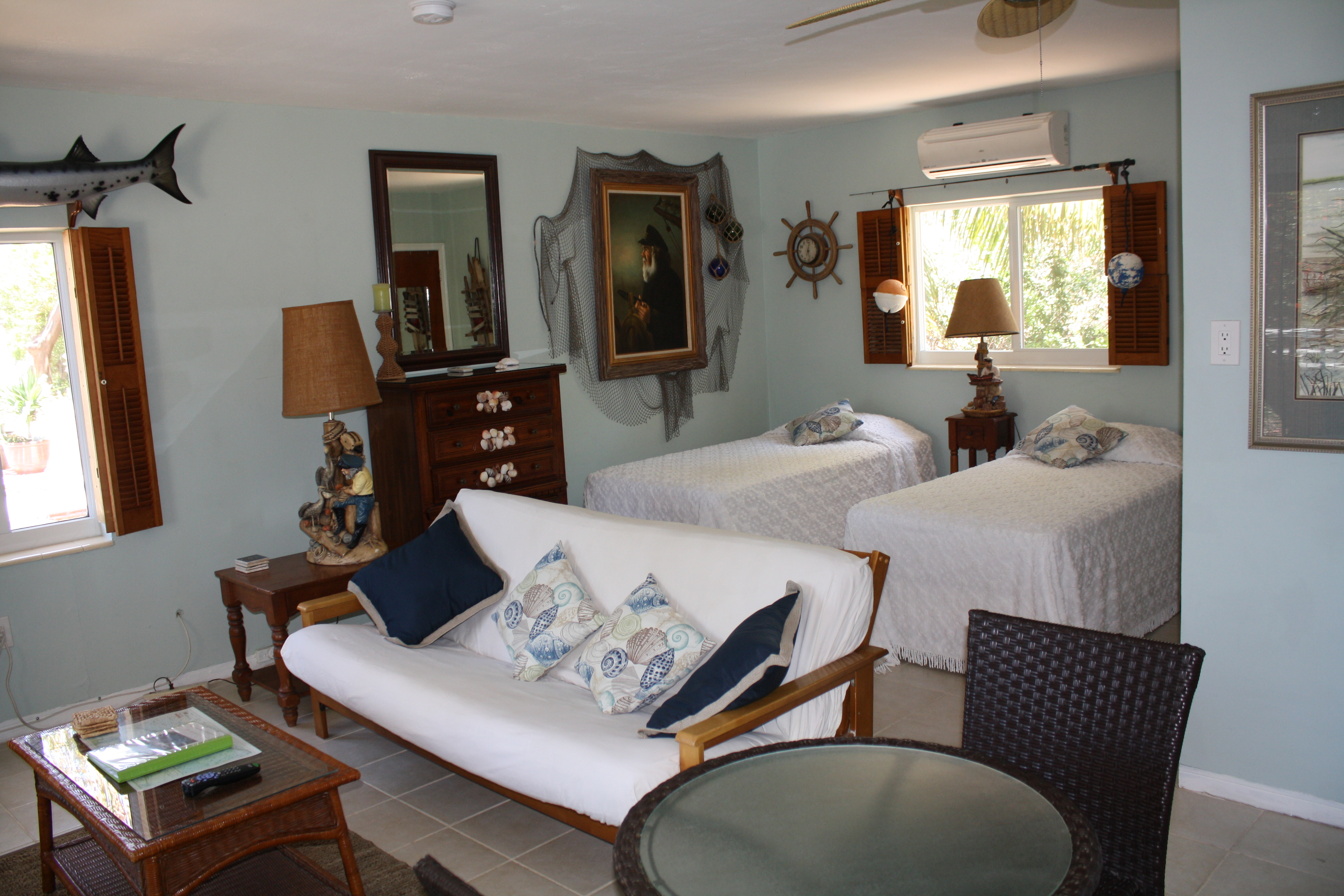 Unit 9 This unit is a fully furnished studio/efficiency. It has two single beds, a futon sofa with a small coffee table, and a small dining table with two chairs and a private bathroom (toilet, sink and shower). It has a fully equipped kitchen with full size refrigerator with freezer, 4 burner stove, microwave and coffee maker. All dishes, pots and pans, towels and linens are provided (not Beach/Pool towels). A quiet mini-split AC will keep you cool at all times.� Smart TV and 100 MB WiFi. The studio has a front porch with two chairs and a small table. It has a small front yard with tropical plants and has its own gas-BBQ grill and picnic table with a large umbrella for shade. |